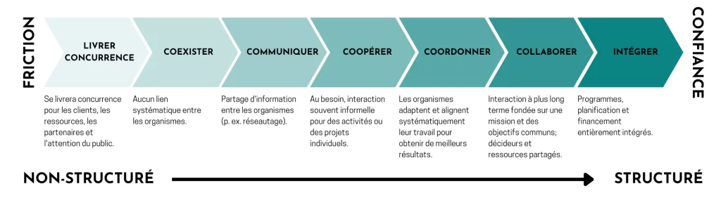 - 3️⃣ La collaboration est un chemin, pas un slogan : Le continuum de collaboration permet de situer un collectif : simple coordination, coopération, ou véritable intégration. Un outil particulièrement utile pour des démarches TE où chacun n’a pas le même rythme ni les mêmes marges de manœuvre.