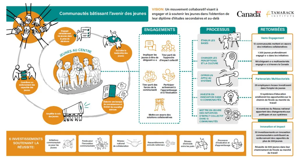 Plus récemment, l’Institut Tamarack a adopté une démarche d’impact collectif dans le cadre de son projet Communautés bâtissant l’avenir des jeunes, un partenariat sur cinq ans entre l’Institut Tamarack, le gouvernement du Canada et vingt communautés réparties au Canada dont l’objectif est de développer des approches impliquant la communauté pour favoriser la réussite des jeunes.