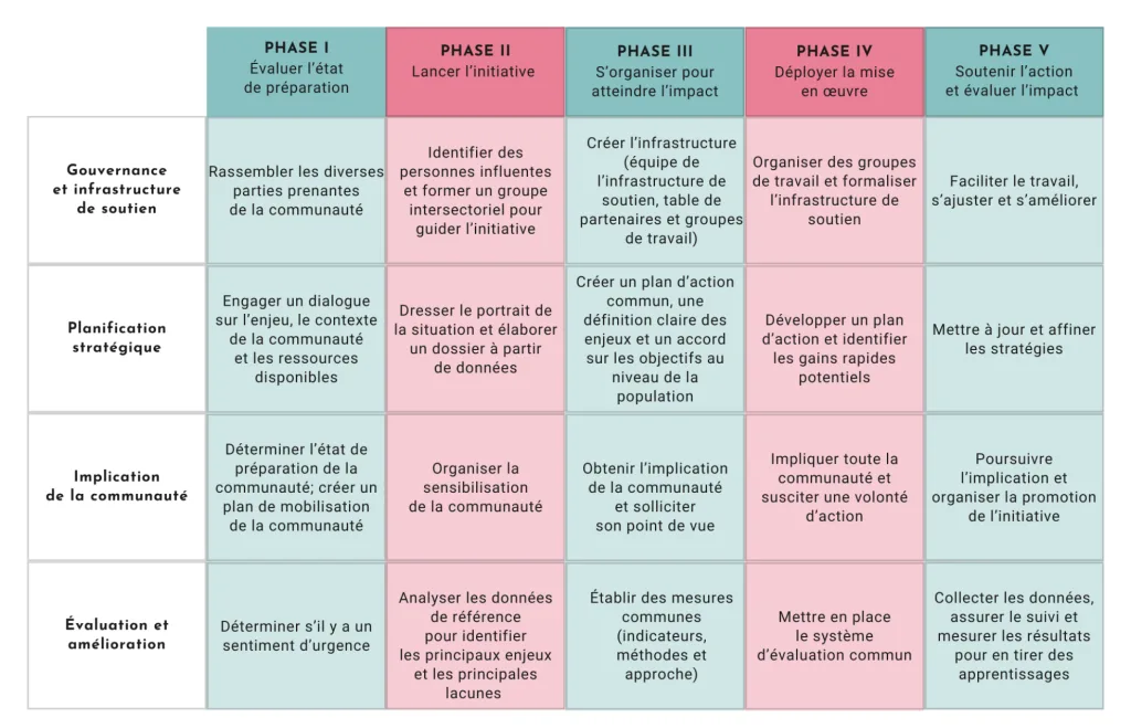 Cette section propose des outils pour rassembler les conditions dans un cadre pour la mise en oeuvre de votre initiative d’impact collectif, de façon simple et articulée.