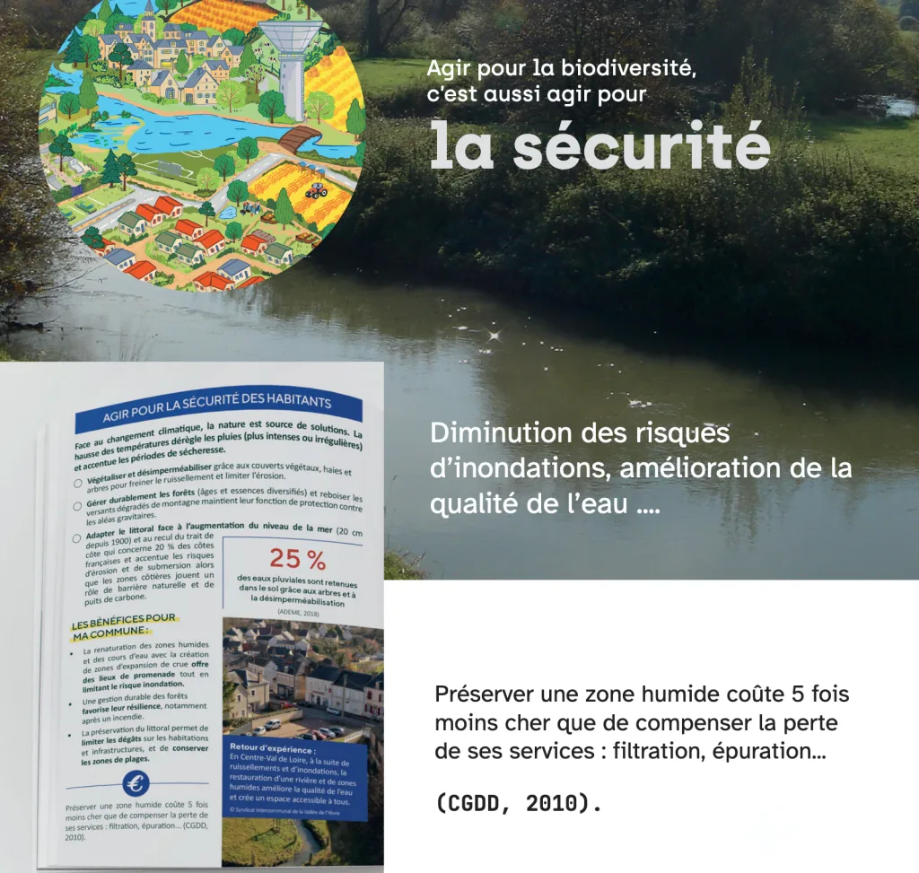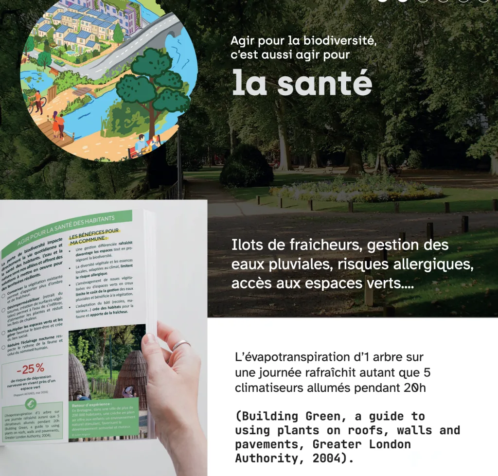 Dans le dépliant « Ma commune demain, la nature comme solution », une ressource conçue par le Réseau des Agences Régionales de la Biodiversité, avec le soutien de l’Office français de la biodiversité et Régions de France, 4 notions sont abordées : santé, sécurité, attractivité et alimentation avec des réponses aux idées reçues, exemples concrets et chiffres clés.