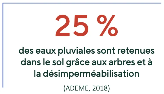 • Désimperméabiliser (retrait du bitume, création de surfaces végétales) permet à l’eau de s’infiltrer, d’alimenter les plantes et réduit les îlots de chaleur.