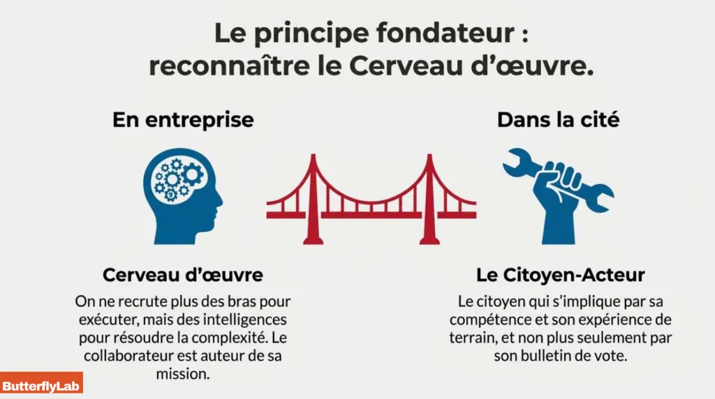 Nos modèles de gouvernance verticaux sont à bout de souffle. À force de traiter le travail comme une variable d’ajustement ou une suite de process abstraits, nous avons éteint l’engagement. La métamorphose proposée par Terra Nova, passer d’une gestion de la « main-d’œuvre » à une culture du « Cerveau d’œuvre », permet de remettre l’intelligence de ceux qui font au sommet de la décision stratégique via un dialogue professionnel de haute intensité.