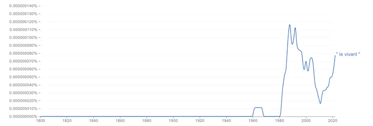 Une rapide recherche du terme « vivant » dans Google Ngram Viewer, qui recense la fréquence des mots usités dans les livres numérisés sur Google Books, permet déjà de repérer deux moments où son usage explose : dans les années 1980 et aujourd’hui.