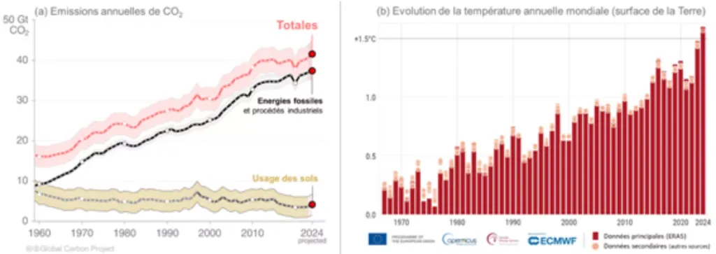A gauche : Hausse des émissions annuelles de CO2. Source : Global Carbon Project 2024, traduction par The Shift Project