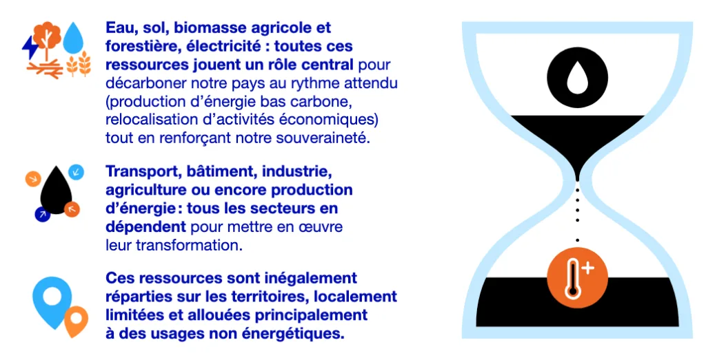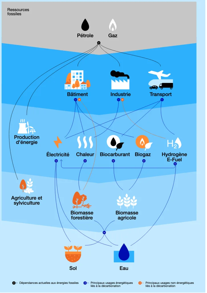 Se passer des énergies fossiles tout en répondant aux besoins énergétiques de la France mobilisera de l’électricité, des biocarburants, du biométhane ou encore des biocombustibles dont la production nécessite de grandes quantités d’eau, de sols, de bois et de biomasse agricole. En plus d’être limitées, ces ressources sont inégalement réparties sur le territoire, déjà allouées à d’autres usages non énergétiques et menacées par le changement climatique.