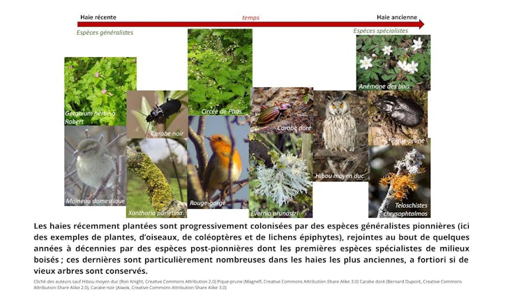 Maintenant, observons un peu ce qui se passe à l’intérieur d’une haie. La haie est un objet hybride : une création humaine artificielle qui se naturalise au fil du temps, et dont l’ensauvagement progressif efface peu à peu l’artificialité au point qu’elle devienne un habitat presque « naturel ». Un nombre croissant d’espèces végétales, animales et microbiennes la colonise alors spontanément : d’abord des espèces « généralistes », participant à la biodiversité ordinaire, puis, au fil des siècles, des espèces de plus en plus « spécialistes », notamment forestières, à la valeur patrimoniale importante.