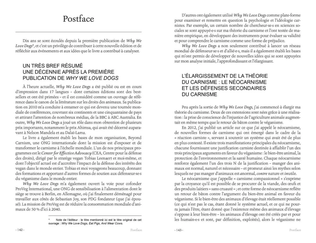 L’autrice a développé une explication implacable de cette logique folle et arbitraire. La raison n’est pas à chercher du côté de nos prétendus besoins de protéines animales – que le livre prend la peine de réfuter, mais d’une idéologie : le carnisme.