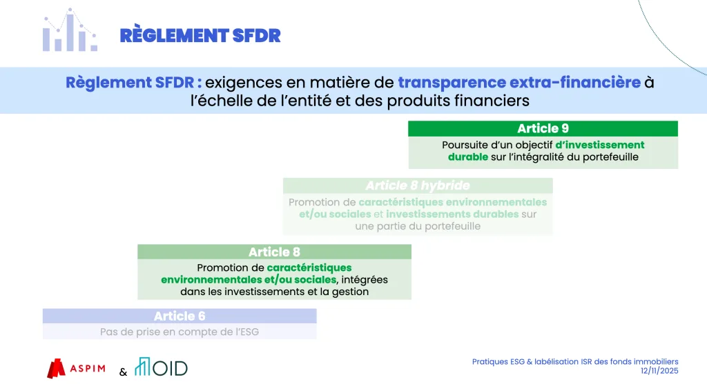Le règlement 2019/2088, dit Sustainable Financial Diclosure Regulation (SFDR) ou Règlement Disclosure, fixe des exigences en matière de transparence extra-financière aux acteurs des marchés financiers de l’Union européenne. Ces exigences s’appliquent à l’échelle de l’entité (société de gestion) et des produits d’investissement (fonds immobiliers par exemple)
