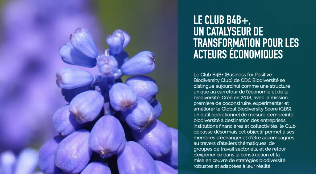 Le Club B4B+ (Business for Positive Biodiversity Club) de CDC Biodiversité se distingue aujourd’hui comme une structure unique au carrefour de l’économie et de la biodiversité. Créé en 2018, avec la mission première de coconstruire, expérimenter et améliorer le Global Biodiversity Score (GBS),