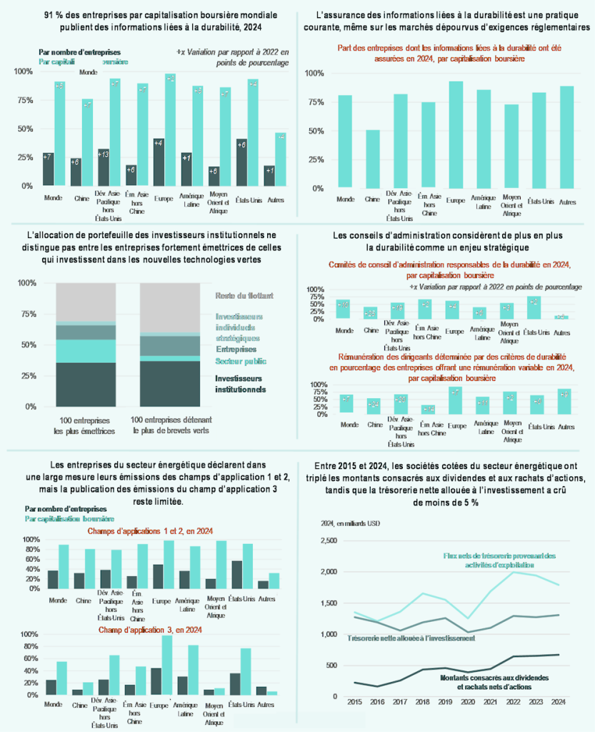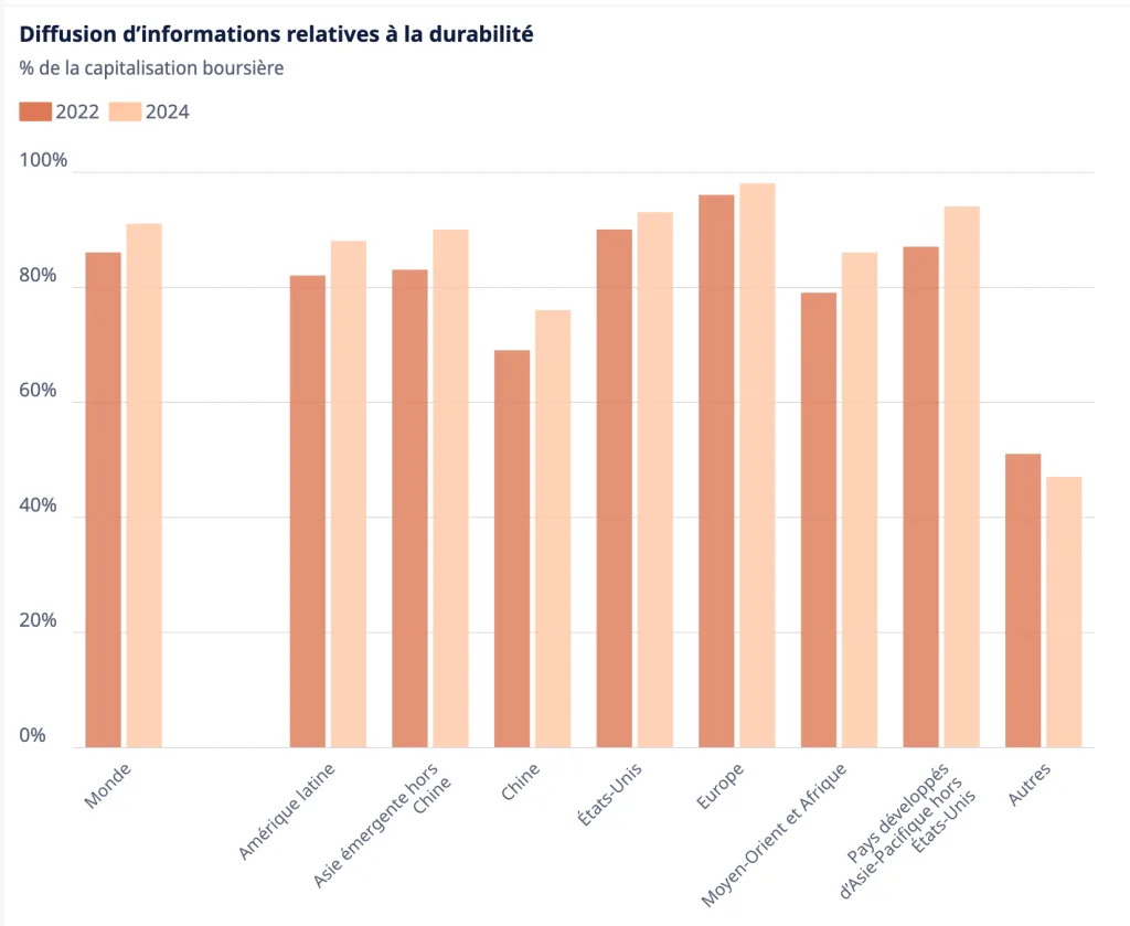 À l’échelle mondiale, 91 % des entreprises par capitalisation boursière ont communiqué des informations liées à la durabilité en 2024, contre 86 % en 2022. L’Europe (98 %), les pays développés de la région Asie-Pacifique hors États-Unis (94 %) et les États‑Unis (93 %) affichaient les taux de publication les plus élevés. Le nombre absolu d’entreprises publiant des informations liées à la durabilité a lui aussi progressé, mais représente toujours une fraction modeste – moins d’un tiers – du nombre total de sociétés cotées.