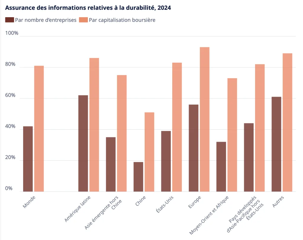 En 2024, plus de 5 000 entreprises (81 % de la capitalisation boursière) qui ont communiqué des informations en matière de durabilité ont fait certifier ces informations par un prestataire de services externe. La majorité d’entre elles s’appuient sur l’assurance limitée (56 %), et beaucoup moins sur l’assurance raisonnable (17 %). À l’échelle mondiale, plus de la moitié des missions d’assurance de l’information en matière de durabilité sont effectuées par des auditeurs.