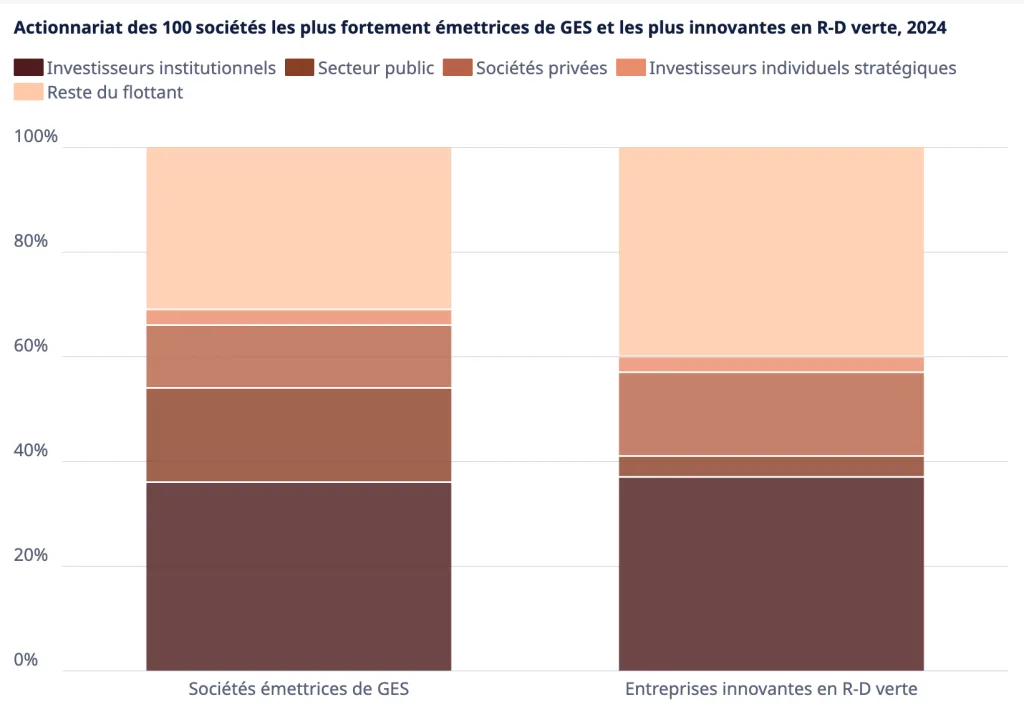 Les investisseurs institutionnels, qui détiennent aujourd’hui 47 % du capital des sociétés cotées dans le monde, procèdent à des allocations de portefeuille comparables dans les entreprises fortement émettrices et dans celles qui investissent dans les nouvelles technologies vertes. Les investisseurs institutionnels détiennent la part la plus significative du capital (36 %) des 100 sociétés cotées les plus fortement émettrices de gaz à effet de serre (GES). Ils possèdent aussi d’importantes participations (37 %) dans les 100 entreprises ayant déposé le plus grand nombre de brevets verts.