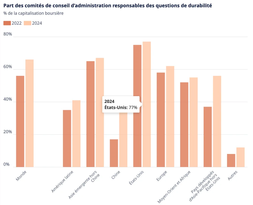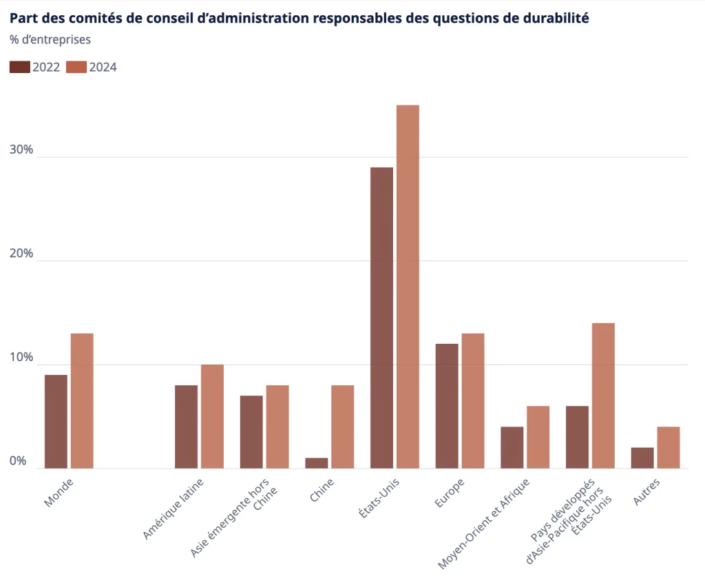 En 2024, dans 70 % des entreprises par capitalisation boursière, le conseil d’administration supervisait les questions liées au climat, contre 53 % en 2022. En outre, les deux tiers des entreprises sont dotées d’un comité chargé de superviser les risques associés à la durabilité. La part des entreprises qui versent à leurs dirigeants une rémunération variable indexée sur des critères de durabilité a également augmenté, passant de 60 à 67 %.