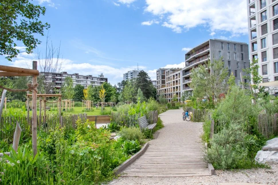 À Zurich, le quartier de Greencity, construit sur un ancien site industriel, est un exemple de réintégration du vivant dans un projet dense : chaque îlot dispose d’espaces verts interconnectés favorisant les espèces locales.