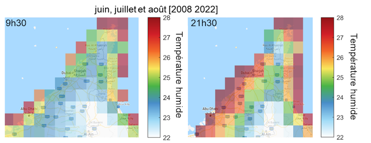 La température humide peut être également particulièrement élevée dans les villes côtières comme celles du golfe persique (telles que Dubaï et Abu Dhabi), en particulier en soirée, lorsque l’air est saturé d’humidité. Cette illustration est une moyenne, mais la variabilité en journée peut comporter des valeurs beaucoup plus élevées de la température humide.