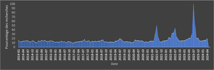 Mais à l’échelle du globe, l’intérêt public par la température humide reste lui relativement récent. Le diagramme ci-dessous montre le pourcentage des recherches Google de l’expression «wet bulb temperature» pour les 10 dernières années dans le monde entier. On note une augmentation nette dans les recherches en 2021, et ce pendant tous les étés depuis.