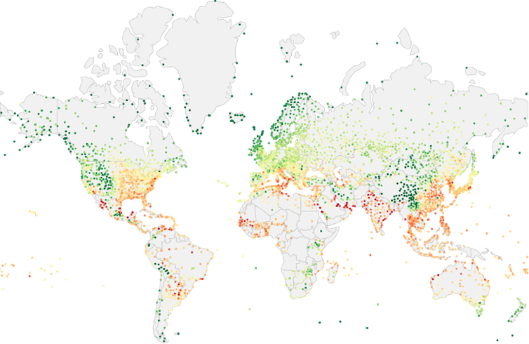 On note aussi le déficit de stations de mesures dans les pays chauds et/ou humides (Afrique, Amérique du Sud, la péninsule Arabique et le sud de l’Asie), où le danger de fortes températures humides est pourtant particulièrement inquiétant.