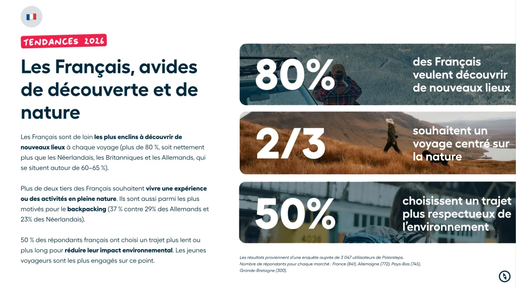 De plus en plus de personnes choisissent délibérément des itinéraires plus longs ou des alternatives à l’avion afin de voyager de manière plus responsable. Selon une enquête menée par l’application de voyage Polarsteps, qui revendique +5 millions d’utilisateurs en France, ce sont surtout les femmes (notamment les Françaises !) et les jeunes qui sont à l’origine de ce changement de consommation.
